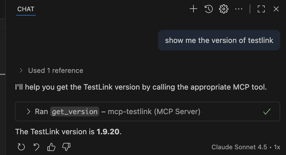 此时在copilot对话中询问testlink的版本则能获取对应信息,如果不启动这个server,copilot知道testlink是什么,但不知道去哪里取,取哪个。